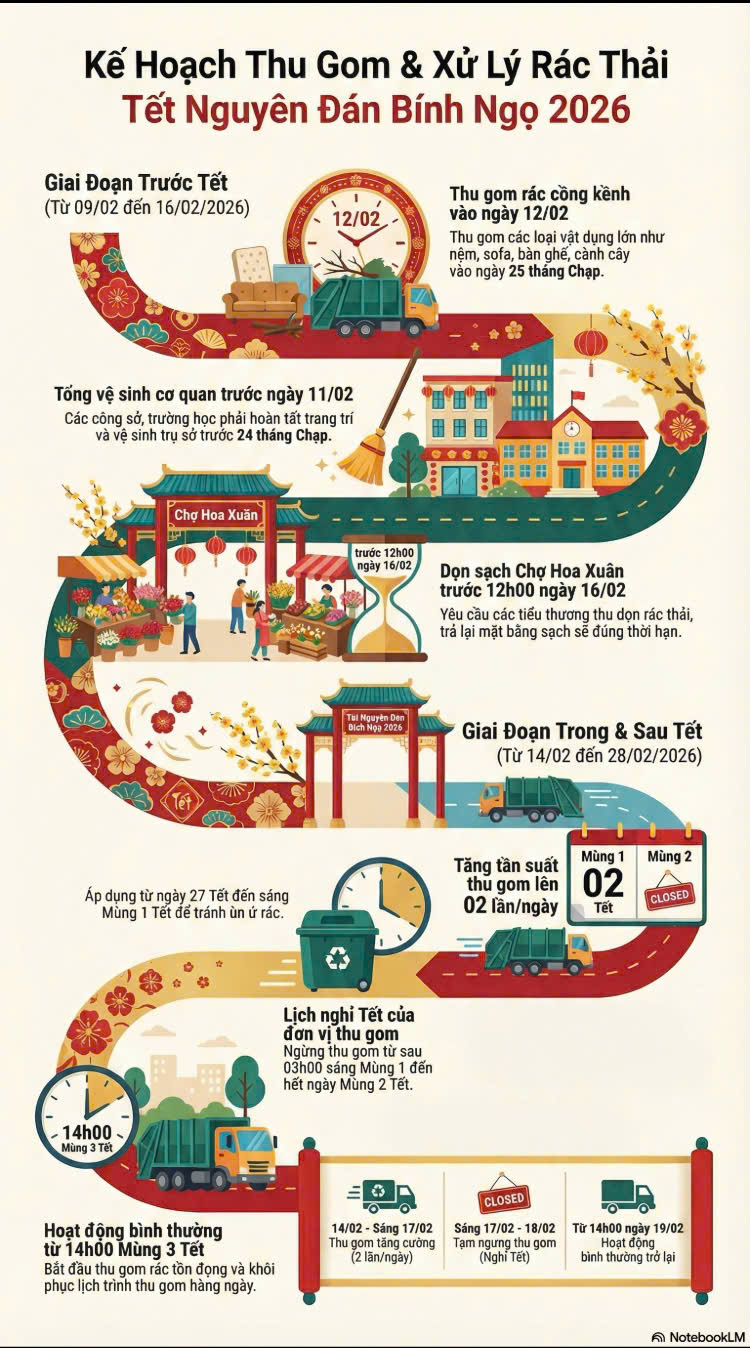 Để đảm bảo công tác thu gom, xử lý chất thải rắn sinh hoạt được thực hiện kịp thời, liên tục, không để tồn đọng nhất là trong những ngày cao điểm trước, trong và sau Tết Nguyên đán Bính Ngọ năm 2026. Giữ gìn vệ sinh môi trường, mỹ quan đô thị và khu vực để nhân dân đón Tết vui tươi, lành mạnh, an toàn. Tạo cảnh quan môi trường "Xanh - Sạch - Đẹp” tại các công sở, cơ quan, trường học, các cơ sở sản xuất kinh doanh, dịch vụ, các khu dân cư, điểm vui chơi giải trí và trong các khu di tích lịch sử văn hóa trên địa bàn xã Long Thành.