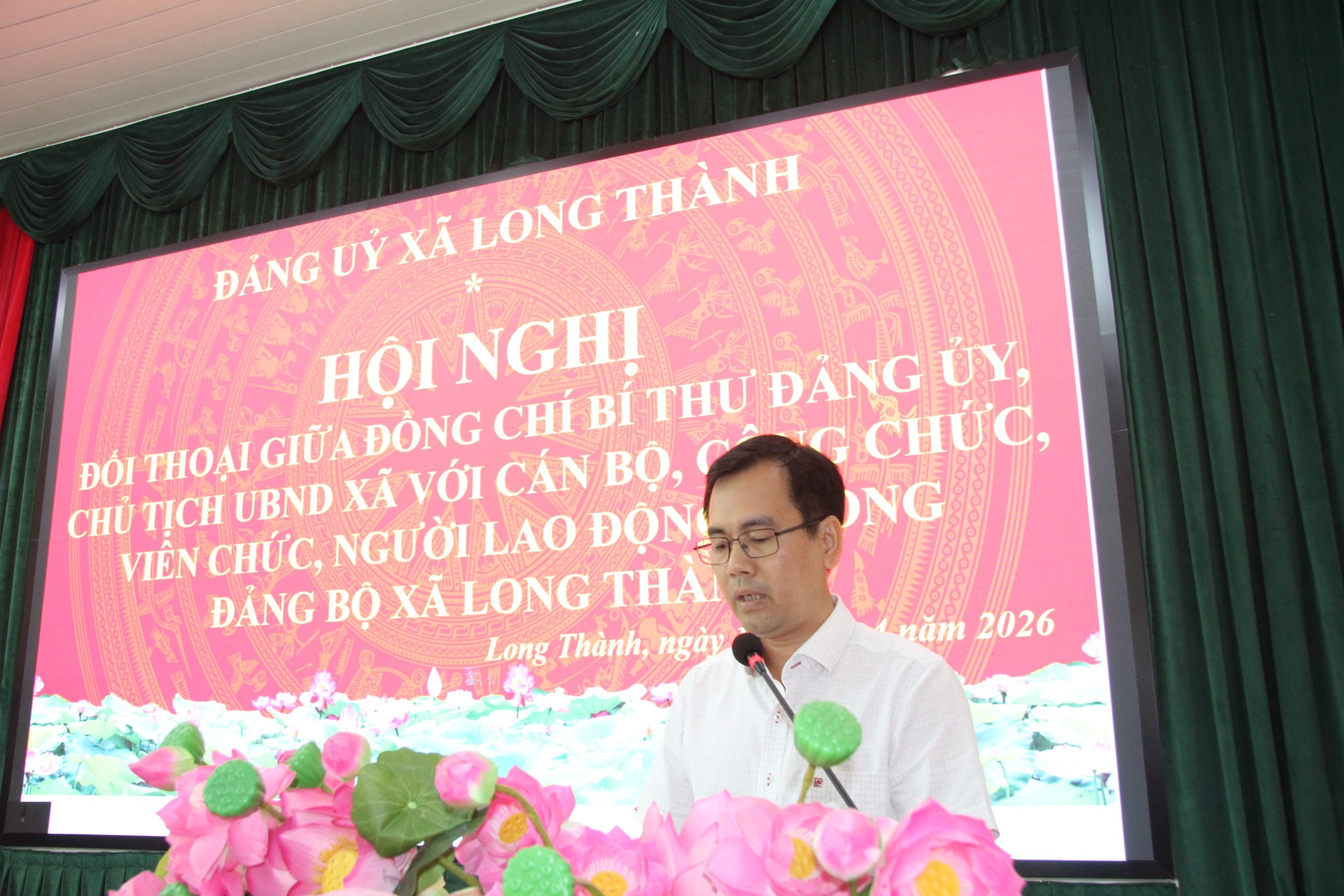 <p>&nbsp; &nbsp; &nbsp; &nbsp; &nbsp; Nhằm tạo diễn đàn dân chủ, cởi mở để cán bộ, công chức, viên chức, người lao động trực tiếp trao đổi, phản ánh tâm tư, nguyện vọng, ý kiến, đề xuất đối với Cấp ủy, Chính quyền địa phương, cụ thể là đồng chí Bí thư Đảng ủy, đồng chí Chủ tịch UBND xã các nội dung có liên quan đến quá trình hoạt động của cả hệ thống chính trị từ khi thực hiện mô hình chính quyền địa phương 02 cấp đến nay.&nbsp;</p><figure class="image"><img style="aspect-ratio:3000/2069;" src="https://longthanh.dongnai.gov.vn/uploads/longthanh/news/2026_04/img_5469_1.jpg" width="3000" height="2069" /><figcaption>Nguyễn Hữu Nguyên-Tỉnh ủy viên, Bí thư Đảng ủy-Chủ tịch HĐND xã và đồng chí Lê Hoàng Sơn-Phó Bí thư Đảng ủy-Chủ tịch UBND xã chủ trì Hội nghị</figcaption></figure><p>&nbsp; &nbsp; &nbsp;Nhằm giúp Bí thư Đảng ủy, Chủ tịch UBND xã nắm bắt kịp thời những khó khăn, vướng mắc trong công tác và đời sống của cán bộ, công chức, người lao động; từ đó có giải pháp chỉ đạo, điều hành phù hợp. Nâng cao hiệu quả lãnh đạo, quản lý, phát huy tinh thần trách nhiệm, tính tiên phong gương mẫu, góp phần xây dựng Đảng bộ và chính quyền xã Long Thành trong sạch, vững mạnh.</p><figure class="image image_resized" style="width:75%;"><img style="aspect-ratio:3000/2000;" src="https://longthanh.dongnai.gov.vn/uploads/longthanh/news/2026_04/img_5466.jpg" width="3000" height="2000" /><figcaption>Đồng chí Nguyễn Sang - Phó Bí thư thường trực Đảng ủy phát biểu chỉ đạo tại Hội nghị</figcaption></figure><p>&nbsp; &nbsp; &nbsp; &nbsp; Hội nghị đã được nghe Phòng Văn hóa - Xã hội báo cáo kết quả vận hành chính quyền địa phương 02 cấp và định hướng một số nhiệm vụ trọng tâm, cấp bách để phát triển địa phương trở thành phường trong thời gian tới. Tại hội nghị, <span>các đại biểu đã trình bày&nbsp;</span>n<span>hiều ý kiến thẳng thắn, tâm huyết tập trung vào các vấn đề liên quan đến điều kiện làm việc, cơ sở vật chất; phân công nhiệm vụ, khối lượng công việc và kinh phí hoạt động tại các đơn vị. Ngoài ra, còn có các ý kiến đóng góp xây dựng cảnh quan, môi trường, nước sạch, cải cách hành chính … để xứng tầm khi lên phường.</span></p><figure class="image image_resized" style="width:75%;"><img style="aspect-ratio:3000/2000;" src="https://longthanh.dongnai.gov.vn/uploads/longthanh/news/2026_04/img_5455.jpg" width="3000" height="2000" /></figure><p style="text-align:justify;text-indent:36.0pt;"><span>Các ý kiến đã được lãnh đạo xã và các phòng chuyên môn ghi nhận, giải đáp rõ thể hiện tinh thần cầu thị, trách nhiệm, dân chủ. Qua đó, tạo sự phấn khởi cho toàn thể cán bộ, công chức, người lao động tiếp tục đoàn kết, cống hiến, nỗ lực thi đua thực hiện thắng lợi các mục tiêu, nhiệm vụ phát triển kinh tế-xã hội, quốc phòng-an ninh mà Nghị quyết&nbsp;</span>Đại hội biểu Đảng bộ xã Long Thành lần thứ 1, nhiệm kỳ 2025-2030 đã đề ra.</p>